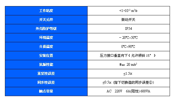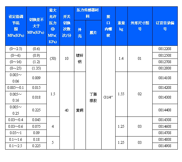 簡介:雙觸點壓力開關采用膜片式傳感器,可用于中性氣體、液體介質。雙觸點壓力開關的設定值可調,調節(jié)范圍0~2.5MPa。主要技術性能:規(guī)格:切換差不可調